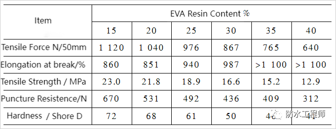 Tableau 1 Effet de la teneur en résine EVA sur les propriétés mécaniques et la résistance à la perforation