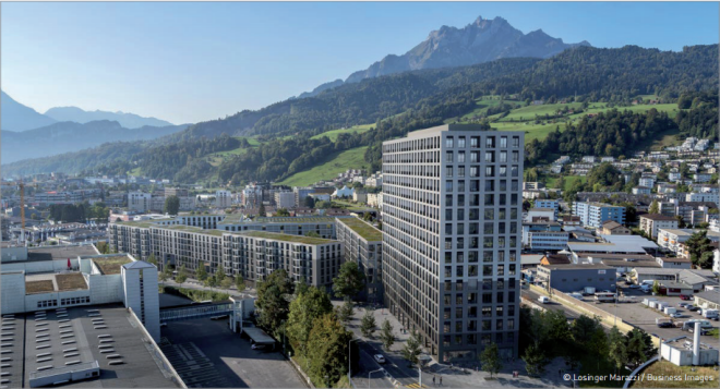 La zone dispose d'un quartier résidentiel vivant à faible teneur en carbone composé de 490 appartements. Tous les bâtiments tels que les magasins, les restaurants, les bains et divers ateliers ont réussi la certification des normes P-ECO Minergigie (certification de construction à faible énergie suisse ) et ont mis en œuvre la norme verte innovante de la communauté de 2000 watts (2000 watts-areal, le concept de la consommation verte par capita.