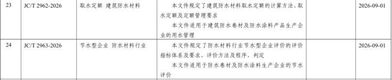 JC/T 2962-2026 « Quota d'extraction d'eau pour les matériaux d'étanchéité des bâtiments » stipule clairement la méthode de calcul, les indicateurs de quota d'extraction d'eau et les exigences de gestion des quotas pour les quotas d'extraction d'eau pour les matériaux d'étanchéité des bâtiments. Il s'applique à l'ensemble de la gestion de l'eau des principaux fabricants de produits, tels que les membranes d'étanchéité des bâtiments et les revêtements imperméables, et régulera efficacement le comportement d'utilisation de l'eau des entreprises et guidera l'industrie pour extraire l'eau de manière rationnelle, utiliser l'eau efficacement et économiser l'eau.