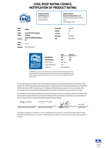 Dès 2018, Canlon a mis en place une équipe dédiée à la recherche sur la technologie des toitures fraîches. Ses produits certifiés ont non seulement réussi l'évaluation des performances CRRC, mais ont également répondu simultanément aux exigences d'économie d'énergie de la certification américaine LEED pour les bâtiments écologiques et de la certification européenne CE. Par exemple, en termes de réflectivité solaire, les données de la certification CRRC peuvent être directement utilisées comme base de notation pour le sous-élément « Optimisation de l'efficacité énergétique » de la certification LEED, aidant ainsi les projets de construction à obtenir plus efficacement des évaluations de bâtiments écologiques. Actuellement, Canlon a établi un dossier de certification CRRC dédié pour cette série de produits, et les consommateurs peuvent vérifier les informations sur les produits certifiés via le site officiel du CRRC, obtenant ainsi « la transparence de la certification et la traçabilité de la qualité ».