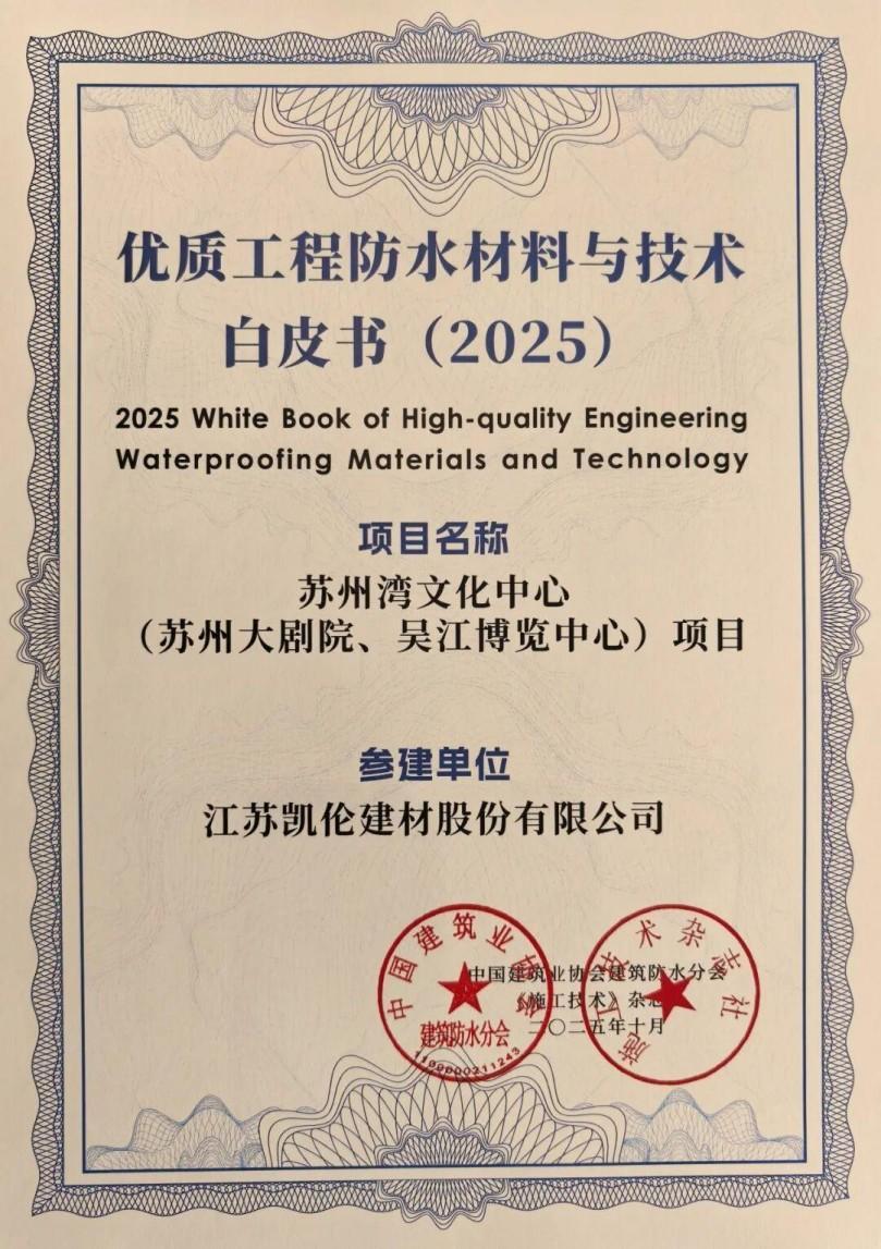 Les 14 et 15 octobre, la conférence d'échange de technologies d'étanchéité et d'anticorrosion 2025, guidée par l'Association chinoise de l'industrie de la construction et organisée par la branche d'étanchéité des bâtiments de l'Association chinoise de l'industrie de la construction, s'est tenue à Xi'an, dans la province du Shaanxi. Lors de la conférence, les projets inclus dans le livre blanc 2025 « Matériaux et technologies d'étanchéité techniques de haute qualité » ont été annoncés, et le projet « Centre culturel de la baie de Suzhou (Grand Théâtre de Suzhou, centre d'exposition de Wujiang) », dans lequel Canlon a participé à la construction, a eu l'honneur d'être sélectionné.
