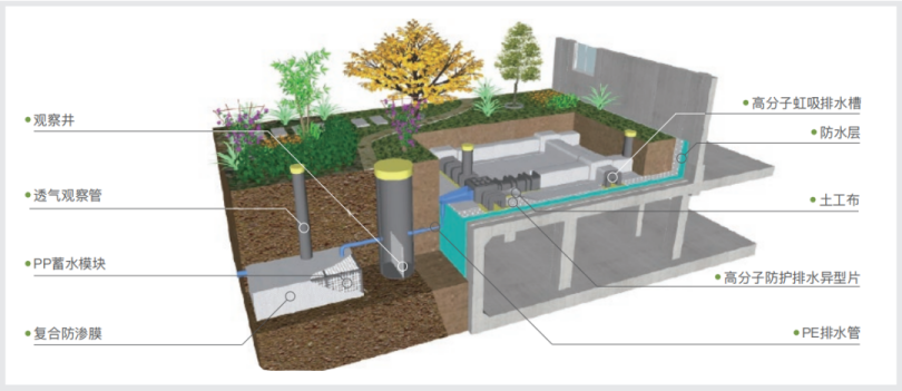 De plus, le parc industriel a développé et lancé de manière innovante le système de collecte de drainage par siphon Canlon Planting Roof Sponge City . Ce système collecte et recycle les eaux de surface et l'eau infiltrée, réalisant une étanchéité et un drainage intégrés tout en répondant aux exigences nationales en matière de conservation de l'eau dans les bâtiments écologiques et aux exigences en matière d'infiltration, de rétention, de stockage, de purification, d'utilisation et de drainage dans la construction de villes éponges.
