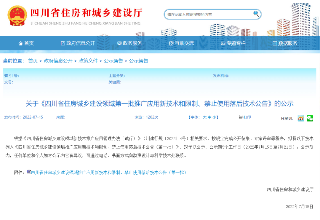 Le 15 juillet 2022, le Département provincial du logement et du développement urbain-rural du Sichuan a publié une annonce publique sur les « Annonces de Premier lot sur la promotion et l'application des nouvelles technologies et la restriction et l'interdiction de l'utilisation des technologies obsolètes dans le domaine du logement et de la construction urbaine et rurale dans la province du Sichuan ' (ci-après dénommé l'annonce).