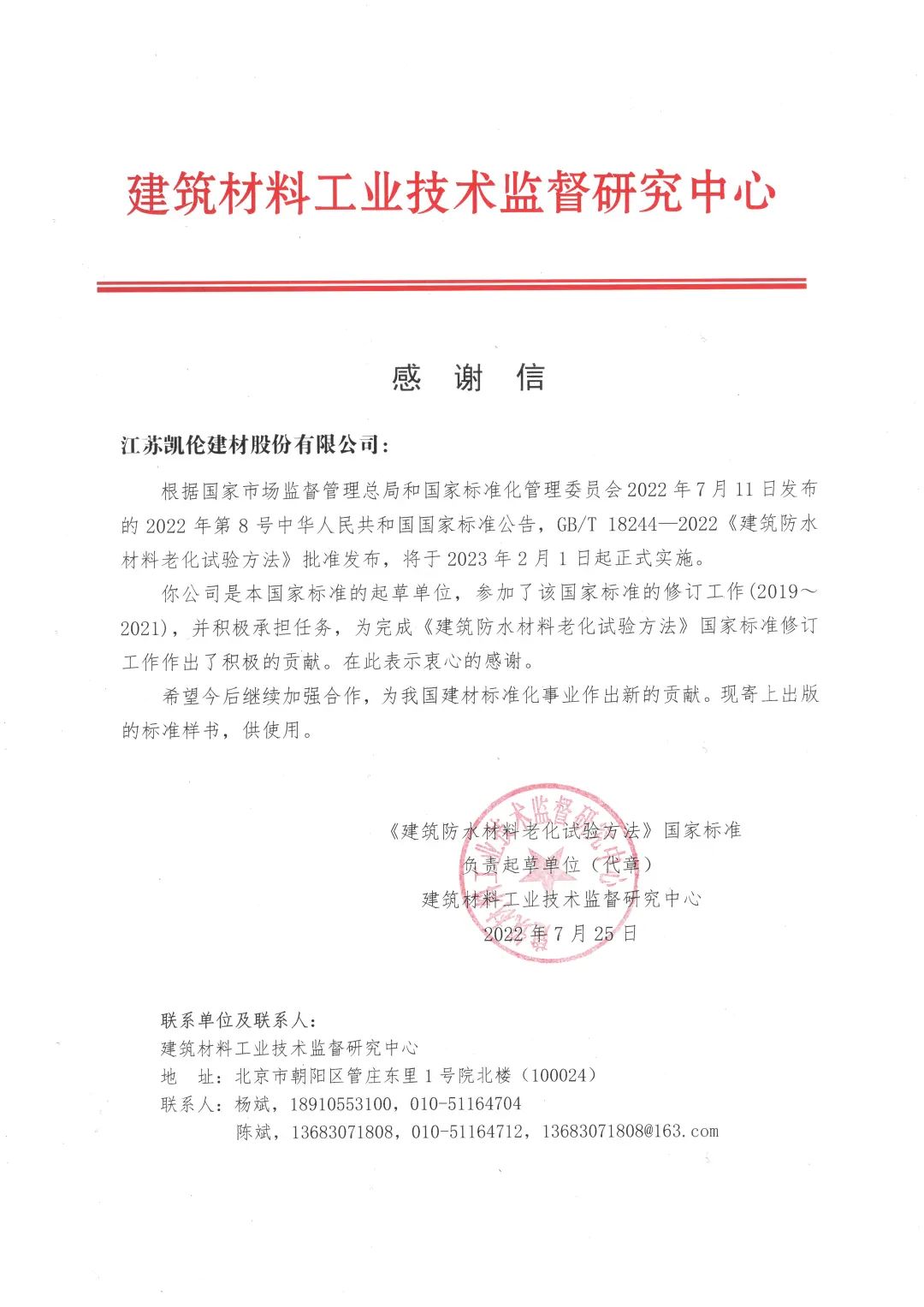 Récemment, la norme nationale « Méthode d'essai de vieillissement pour les matériaux imperméables de construction » co-éditée par Canlon a été officiellement publiée.En tant qu'une des unités de rédaction, Canlon a participé à la révision de la norme nationale et a reçu une lettre d'appréciation du Centre d'encadrement technique et de recherche en bâtiment. Industrie des matériaux.